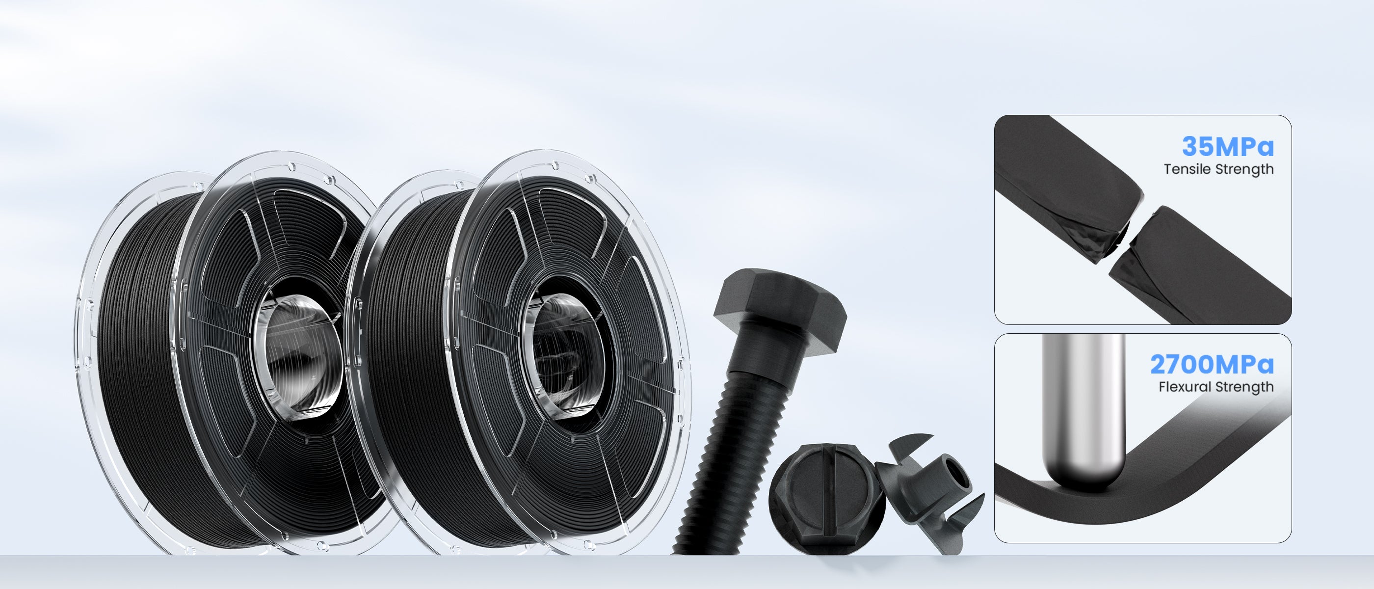 Engineered for durability, the Mecpow PETG-CF filament has a tensile strength of 35 MPa and a flexural strength of 2700 MPa, delivering exceptional toughness and stiffness for demanding industrial applications like drones, tools, automotive parts, and more.