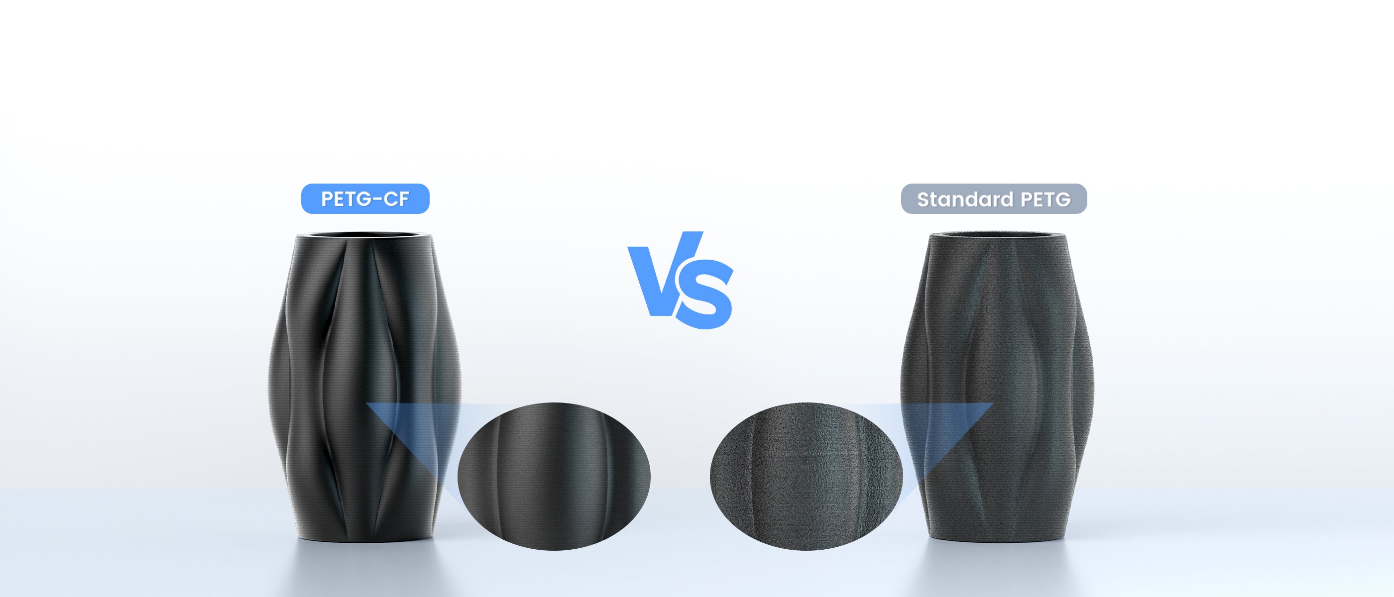 PETG-CF bietet überlegene mechanische Festigkeit, reduzierte Verformung, bessere Maßgenauigkeit und ein hochwertiges mattes Finish. Es eignet sich ideal für Funktionsteile, Prototypen und ästhetische Modelle.
