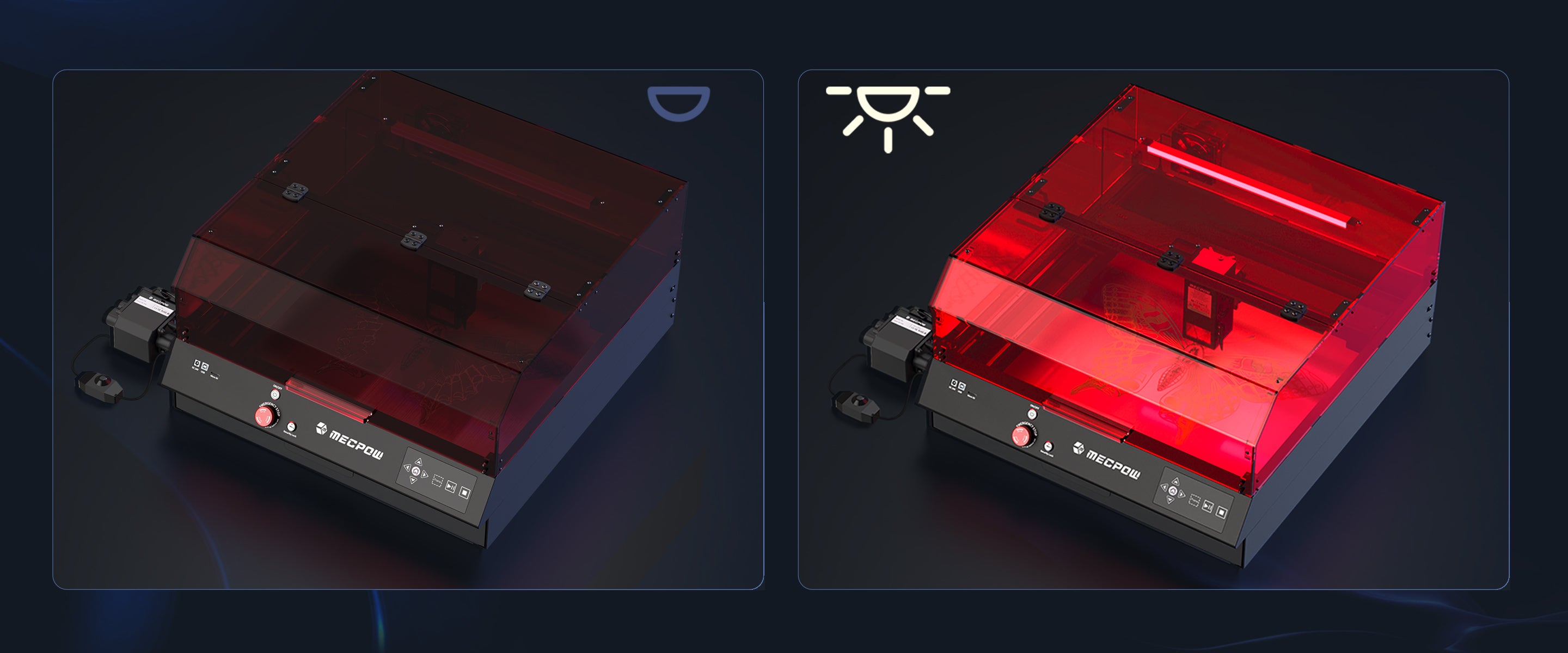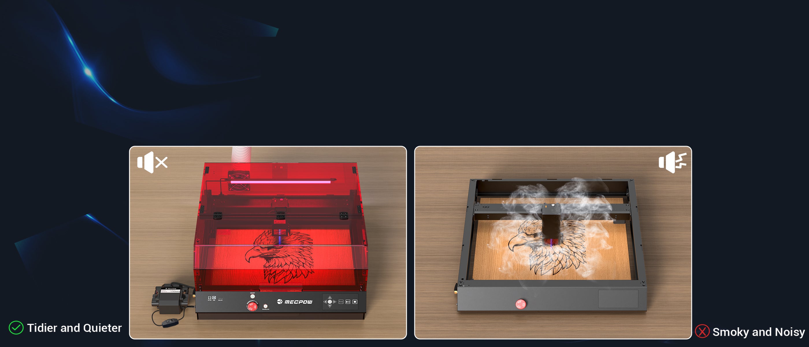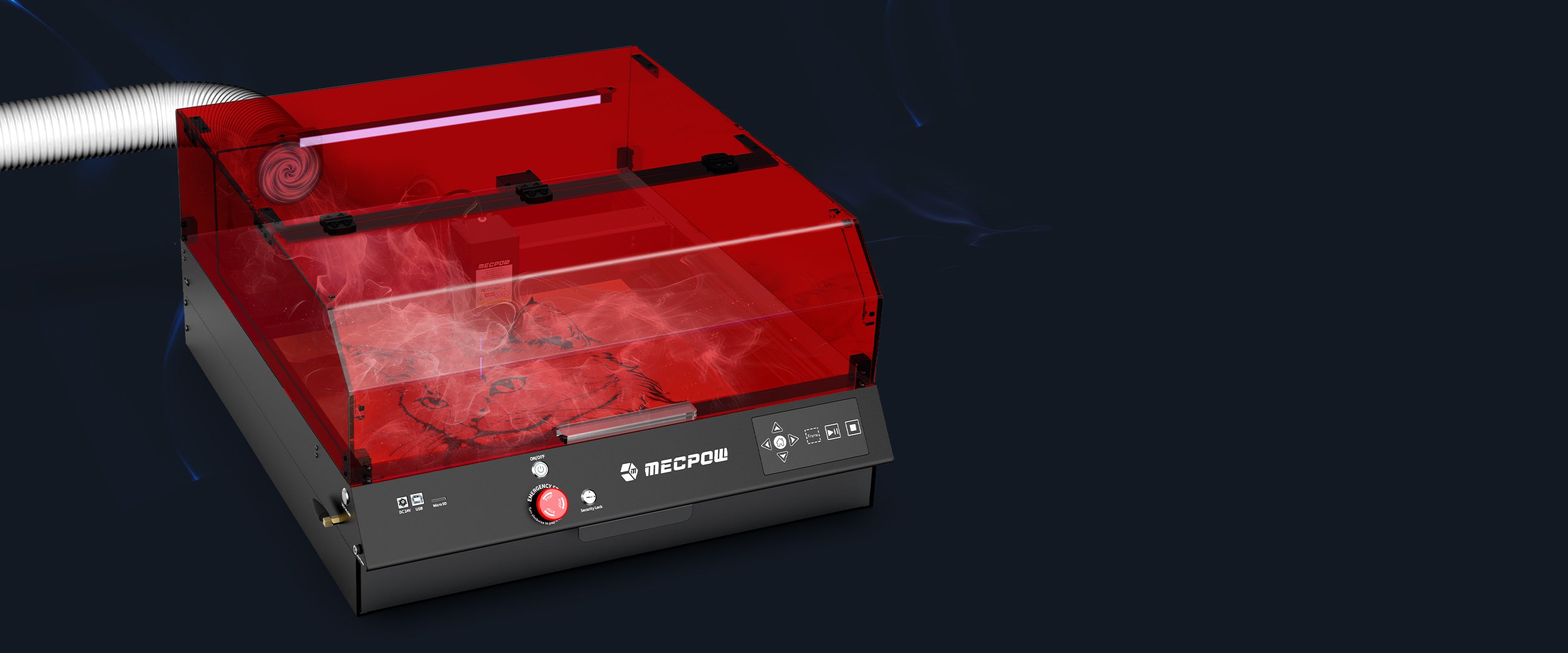 Das geschlossene Design des Mecpow X4 Pro Lasergravierers sorgt für umfassenden Schutz und eine saubere und ruhige Umgebung, die den Benutzer vor Lärm und Rauch schützt. Der leistungsstarke Lüfter optimiert den internen Luftstrom, um schädlichen Rauch und Partikel effektiv herauszufiltern, Verbrennungen zu verhindern und eine sicherere und angenehmere Umgebung für die Gravur innerhalb des Gehäuses zu schaffen.