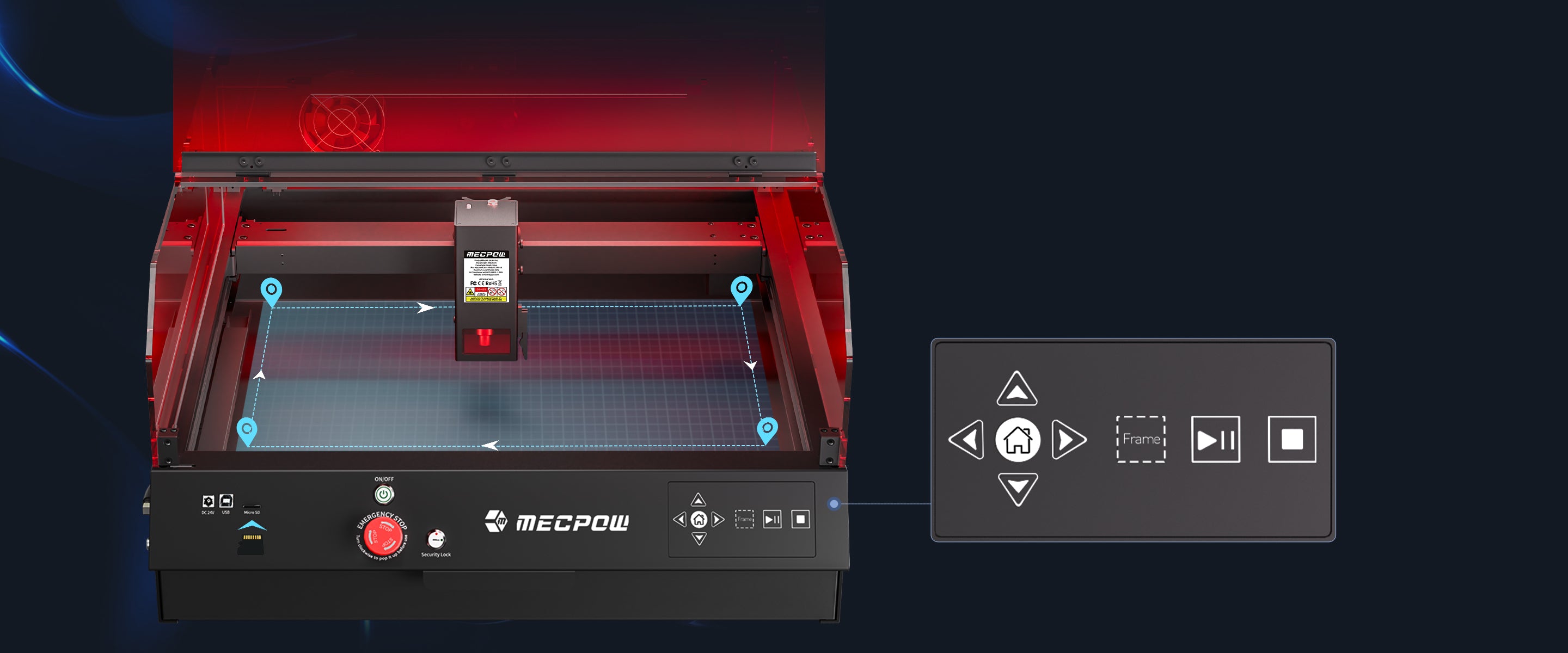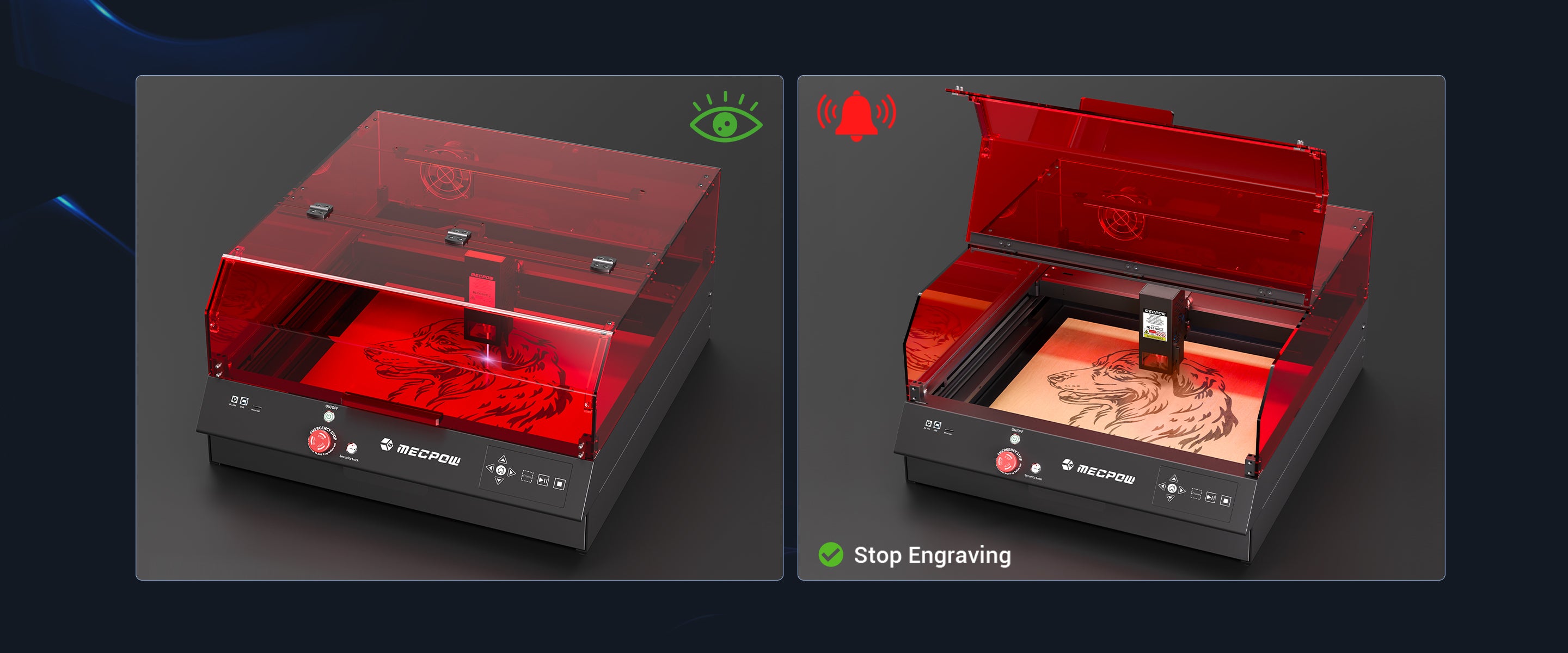 Der Mecpow X4 Pro ist eine FDA-zertifizierte Laserschneid- und Graviermaschine der Klasse 1, bei der die Sicherheit der Benutzer vom Anfänger bis zum Profi an erster Stelle steht. Mit einer integrierten Auto-Stopp-Funktion stoppt er automatisch den Betrieb, wenn die Schutzabdeckung geöffnet wird. Der Gravierer ist außerdem mit einem Sicherheitsschloss, einem Flammensensor, einem Not-Aus, einem Neigungssensor und Endschaltern ausgestattet, die alle die Sicherheit von Benutzern und Maschine vollständig gewährleisten.