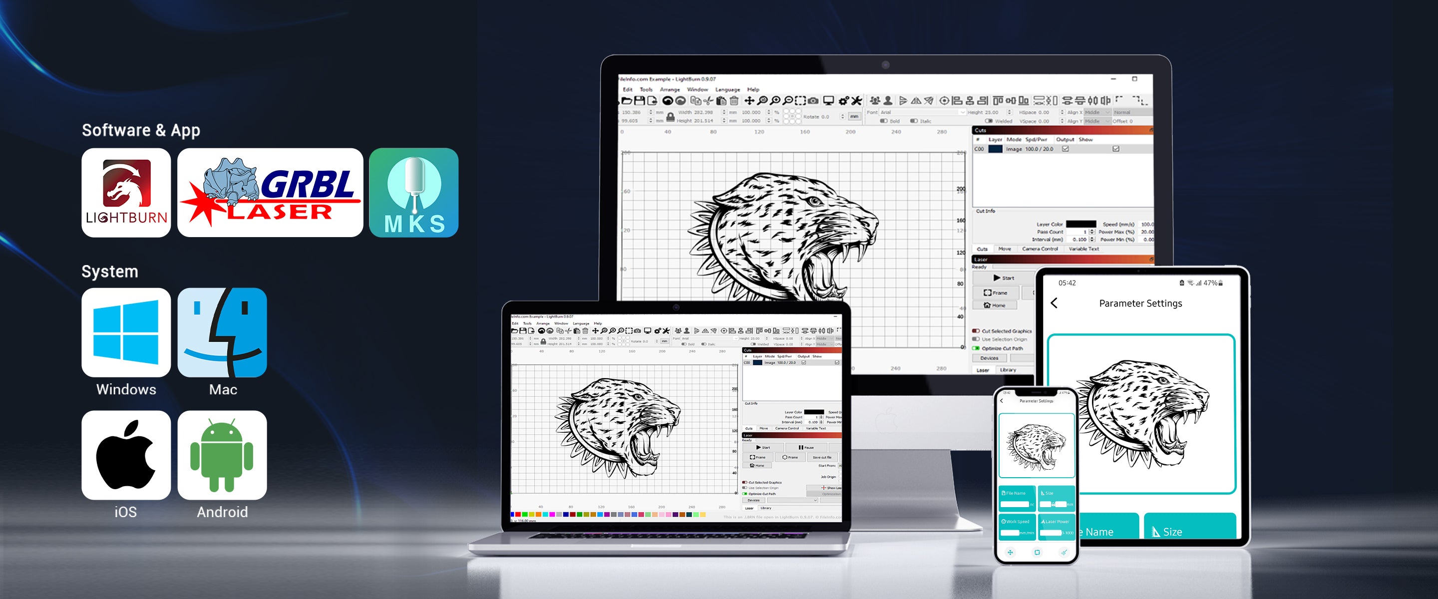 Es unterstützt mehrere Betriebssysteme: Windows, Mac, Linux, Android und iOS und ist kompatibel mit Software wie LaserGRBL und LightBurn.