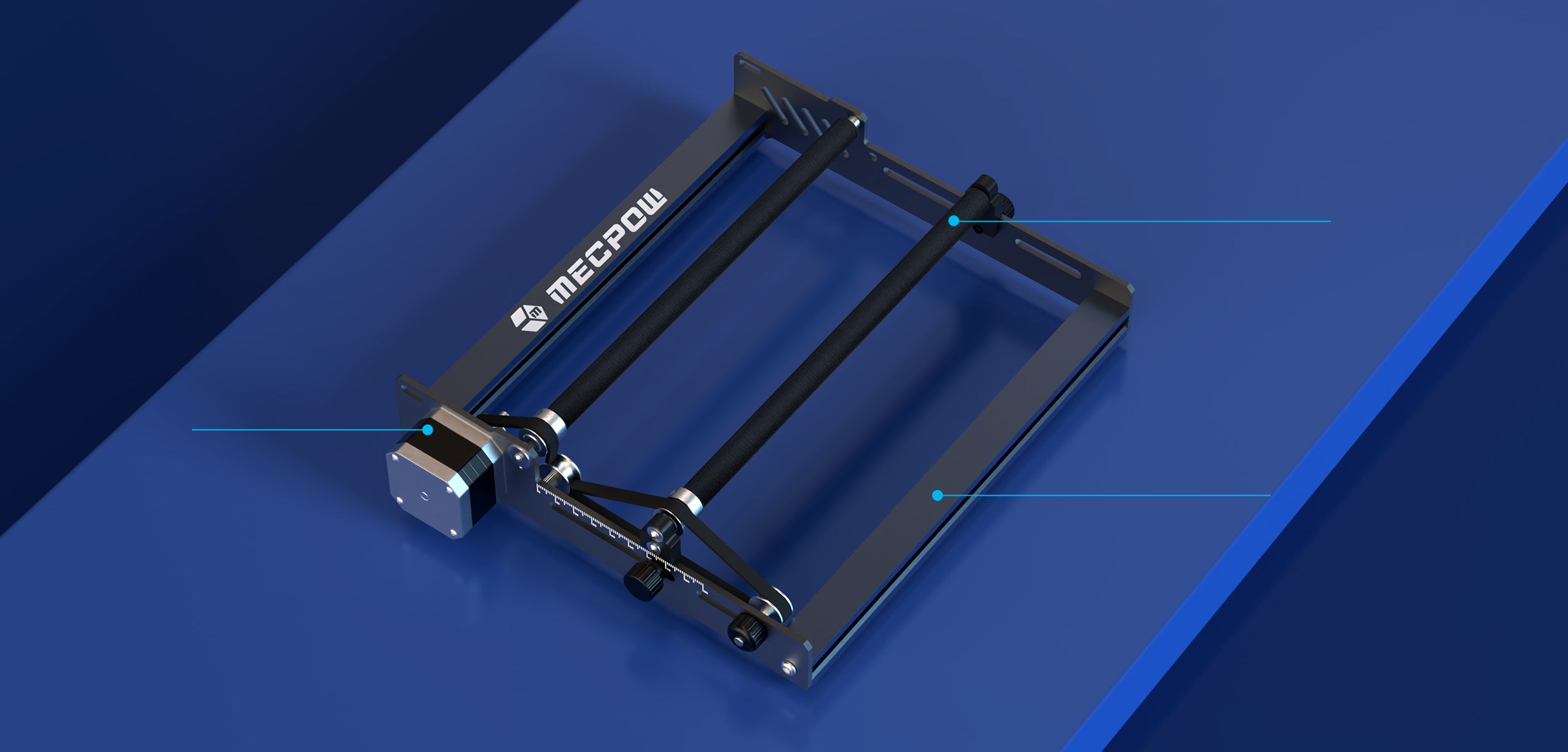 El rodillo rotatorio Mecpow funciona a la perfección con casi todas las impresoras 3D, grabadoras láser y fresadoras CNC. Su ancho ajustable, de 12 a 75 mm, junto con sus cuatro elevadores, permite grabar y cortar una mayor variedad de objetos cilíndricos que sus competidores.