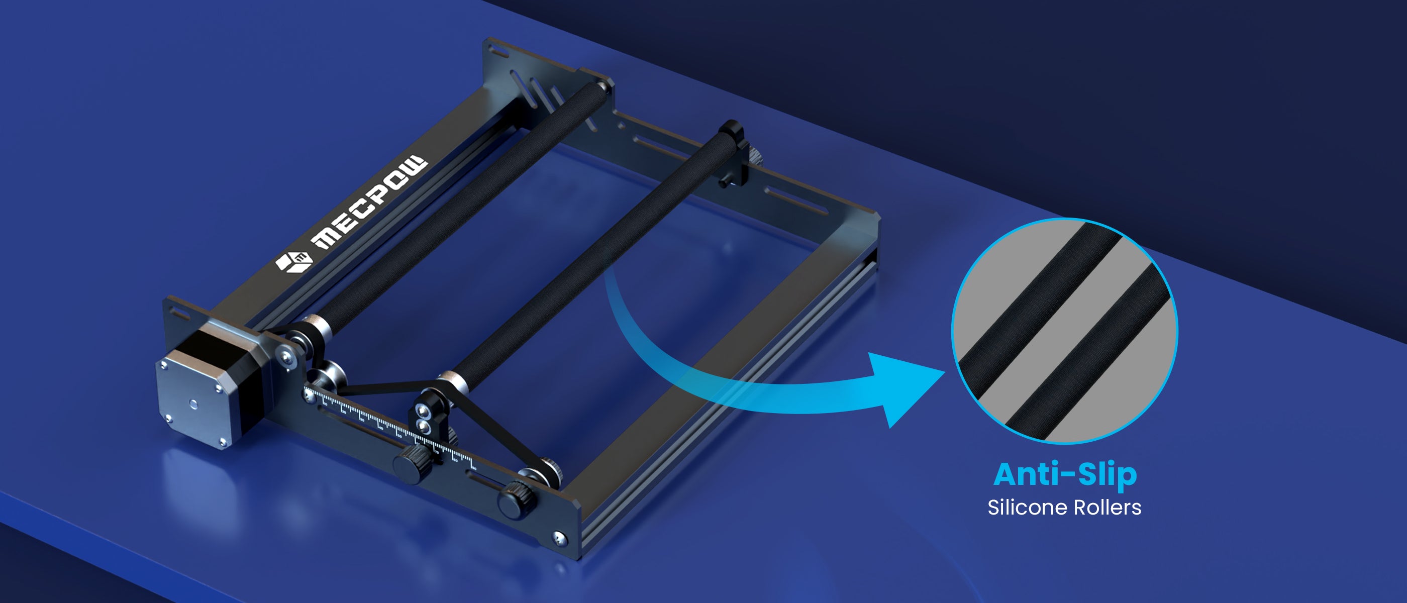 La sua struttura innovativa è dotata di due rulli in silicone antiscivolo e di una cinghia di distribuzione con tensione regolabile, creando una struttura potente che trattiene saldamente il cilindro di incisione e riduce lo scivolamento dell'oggetto di un sorprendente 99%, per garantire la precisione in ogni attività di incisione e taglio.