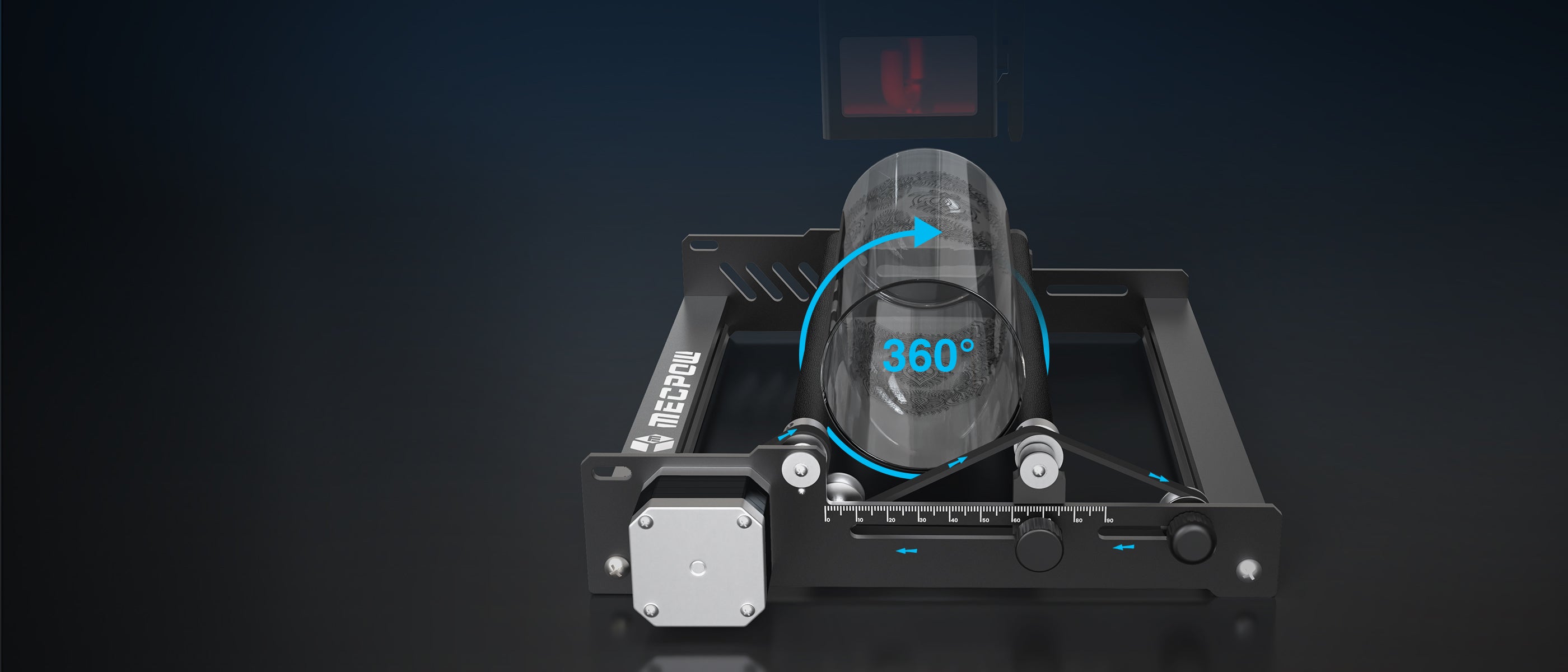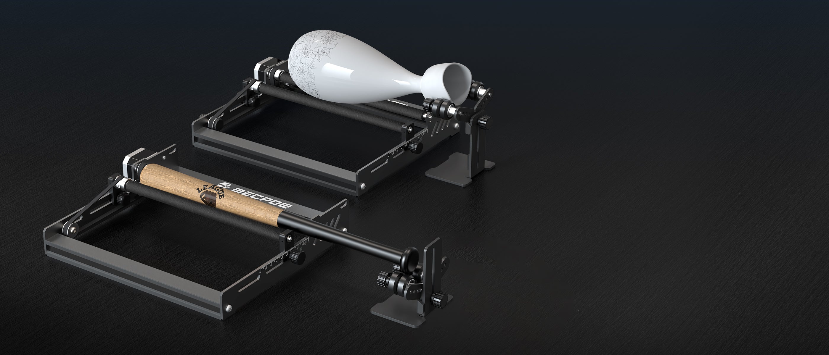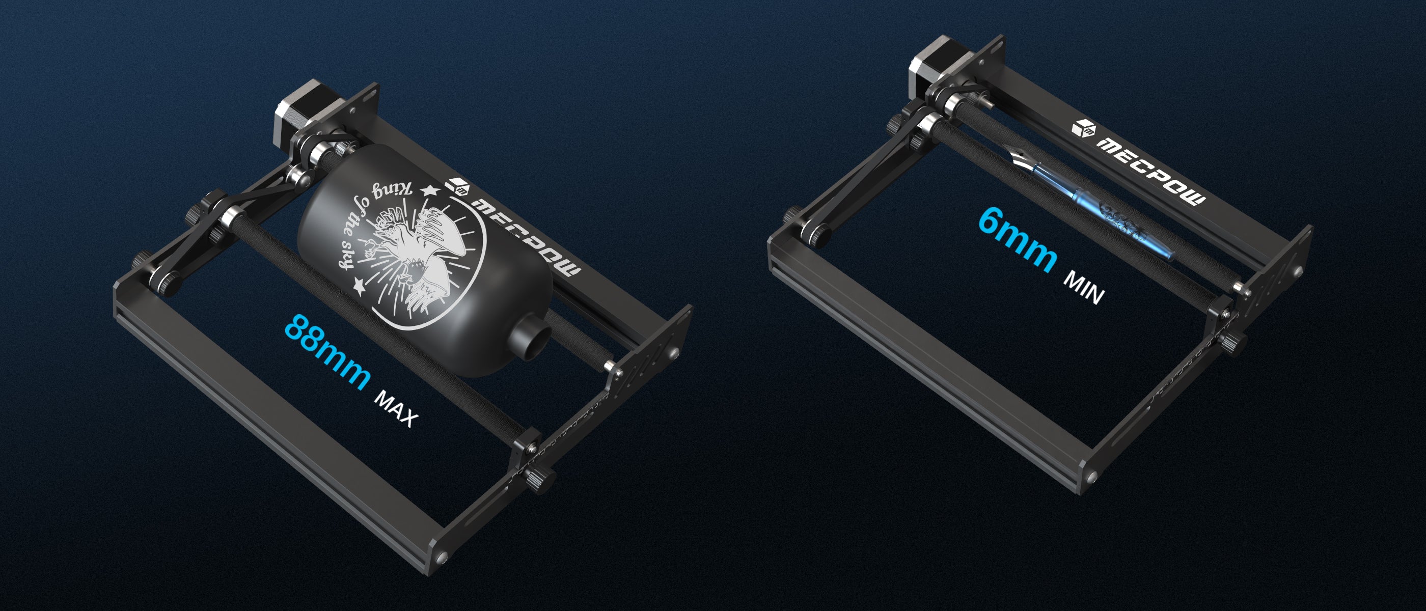 Il modulo a rulli rotanti Mecpow G3 Pro è dotato di un supporto a forma di Y con 5 angoli regolabili. Ciò consente agli utenti di regolare facilmente la larghezza e l'altezza e creare un equilibrio per l'incisione di varie forme di oggetti come bicchieri da vino, mazze da baseball, penne, ecc.