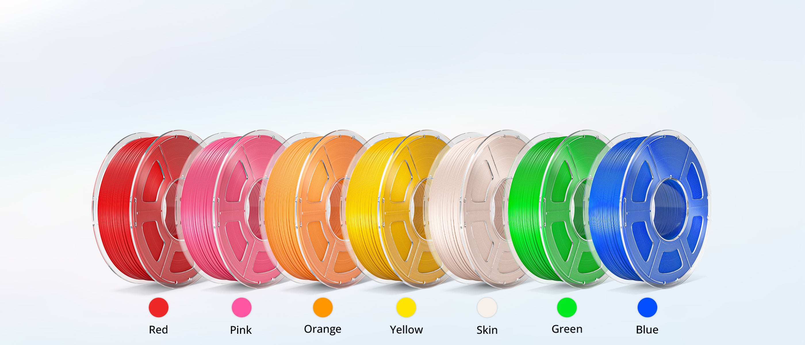 With 7 color choices, the PLA+ high-speed printing filaments adapt effortlessly to any project or style, enabling users to create a wide array of imaginative and innovative designs. They can be used decoratively as art figurines, gifts, or display models; educationally as teaching aids, student projects, or demonstration tools; or temporarily for single-use packaging or low-temperature components.