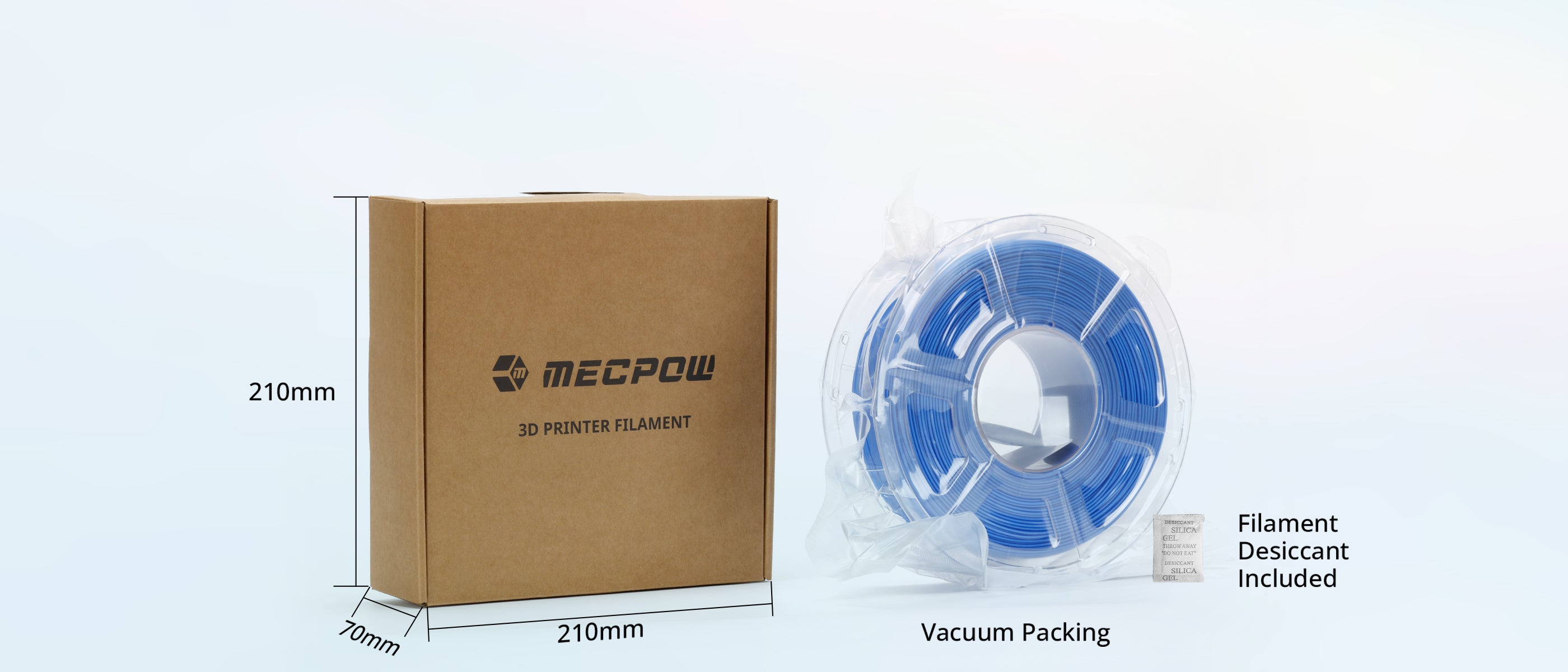 To maintain integrity and performance, Mecpow 3D printing filaments are thoughtfully vacuum-packed with a desiccant. This careful packaging method protects the filaments from dust and contaminants, ensuring you receive a pristine product ready for your next creative project.