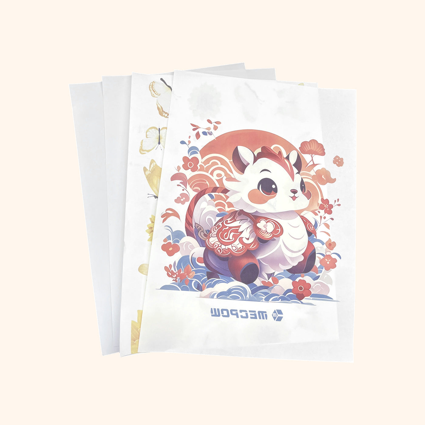 La pressa a caldo Mecpow MP-3881 è dotata di 4 fogli di carta per sublimazione, 2 con immagini e 2 vuoti, che ti consentono di personalizzare i tuoi disegni sui fogli di carta per sublimazione vuoti.