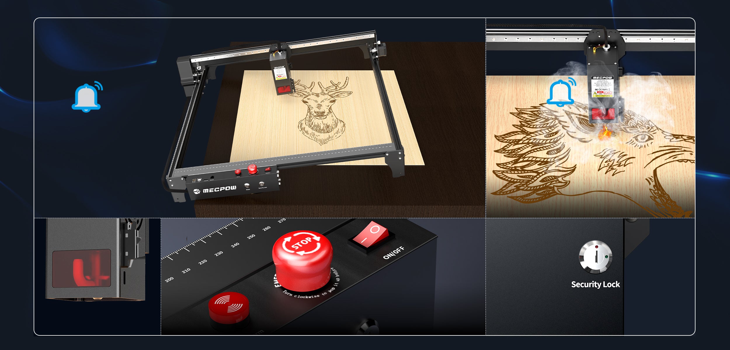 L'incisore laser Mecpow X5 vanta un sistema di protezione multipla senza pari che dà priorità alla tua sicurezza e a quella della tua famiglia: un sensore di fiamma rileva eventuali rischi di incendio durante l'incisione, attivando avvisi e arresti della macchina. Un pulsante di arresto di emergenza interrompe immediatamente le operazioni in caso di emergenza. Un allarme di inclinazione suona se la macchina viene sollevata oltre un angolo sicuro. Un blocco di sicurezza impedisce l'azionamento accidentale da parte di bambini curiosi, mentre la testa laser include una schermatura protettiva per gli occhi. Queste misure di sicurezza garantiscono più livelli di protezione mentre scateni i tuoi sforzi creativi.