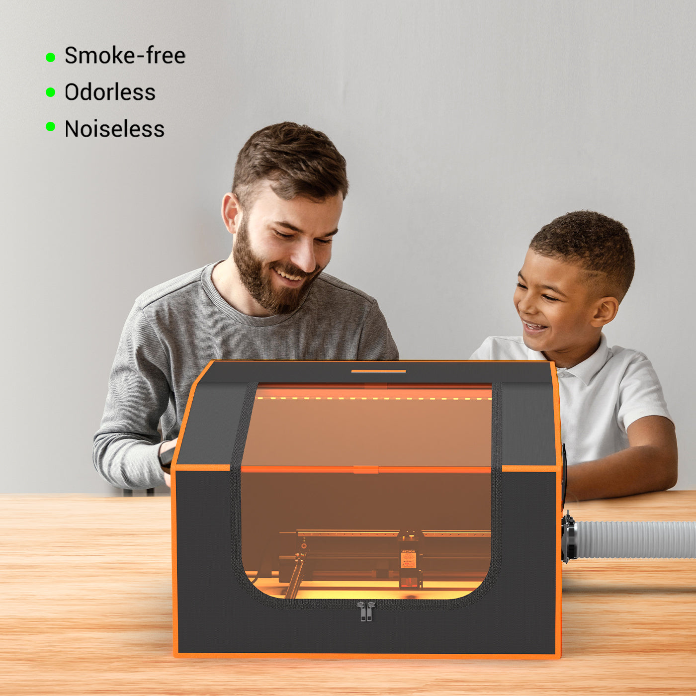 The Mecpow FC2 engraving protective enclosure is designed to effectively and quickly isolate large amounts of smoke and unpleasant odors produced during the engraving process. Its large size, robust fan, and fire-resistant exhaust pipe ensure the air quality of your surroundings remains fresh and clean. It assists you in engraving comfortably without smoke or pungent odors.