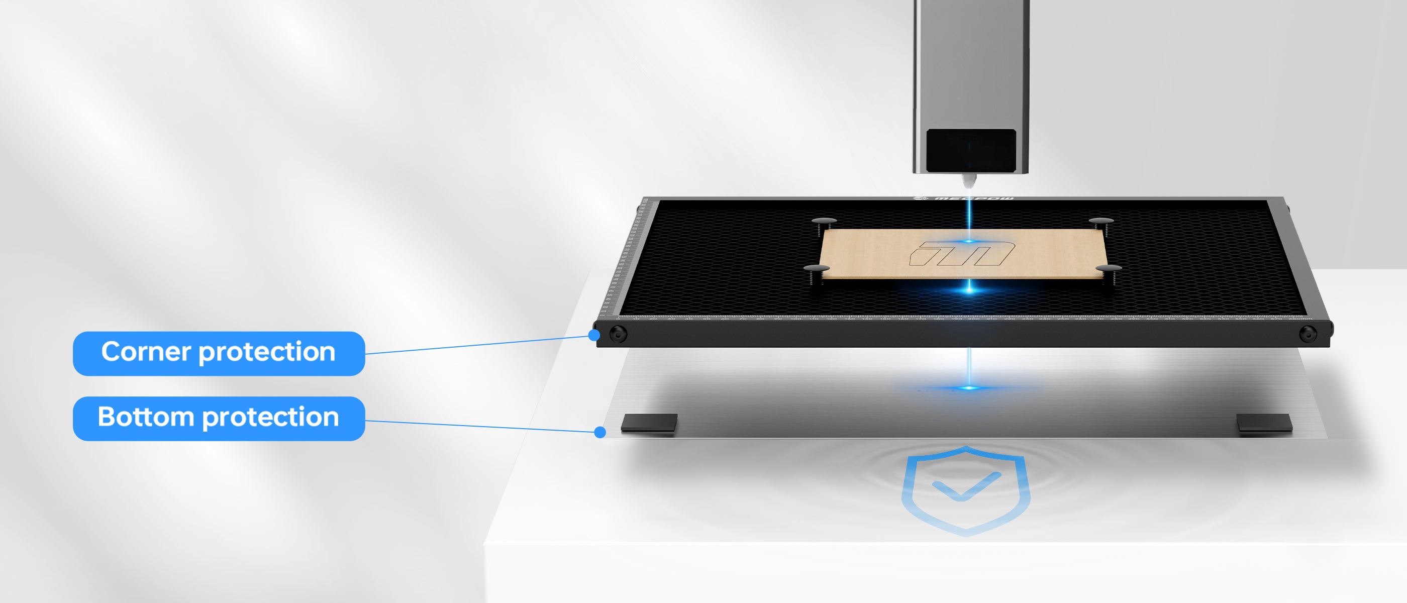 To safeguard your workbench, the kit includes an aluminum backing plate that matches the panel size (410x340 mm). When placed underneath the honeycomb bed, it effectively blocks laser penetration. The set also includes 10 plastic nails and 10 silicone pads to help secure your materials and prevent movement during operation, while corner protectors ensure safe handling and setup.