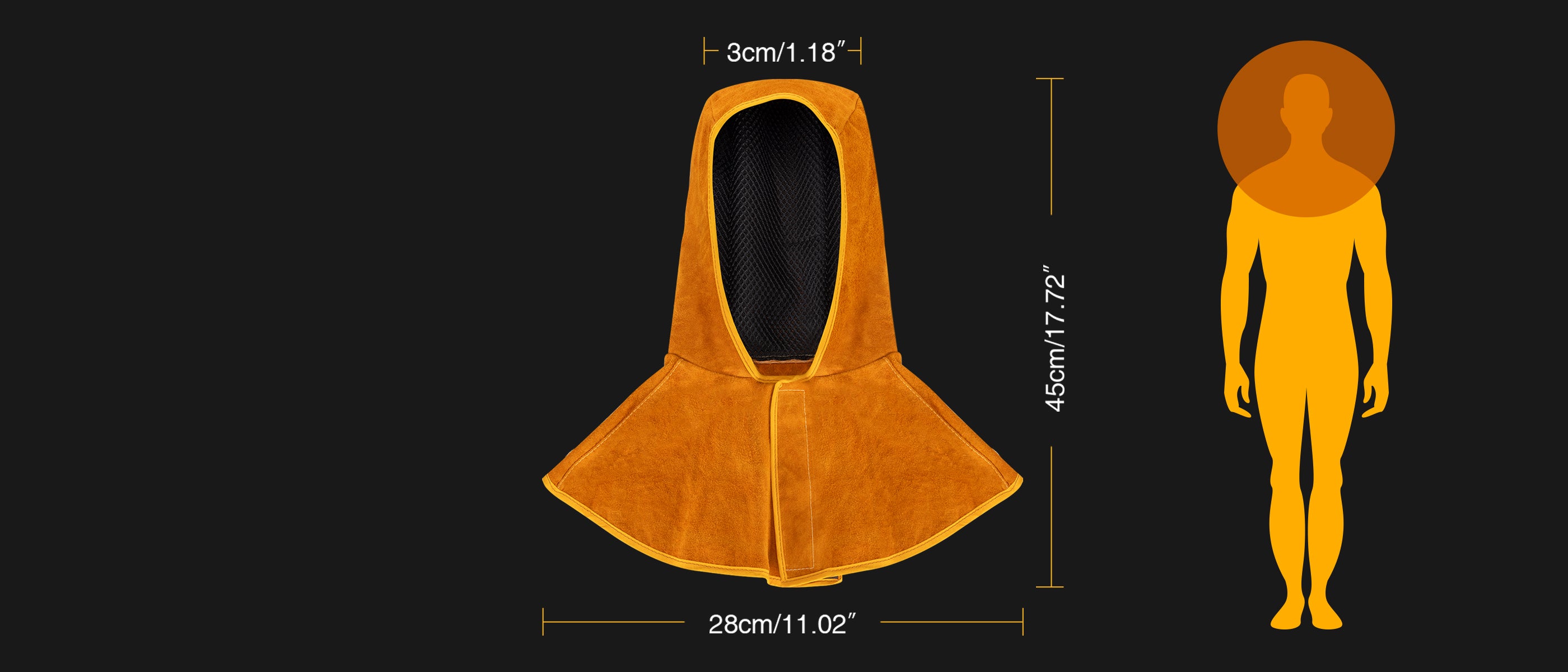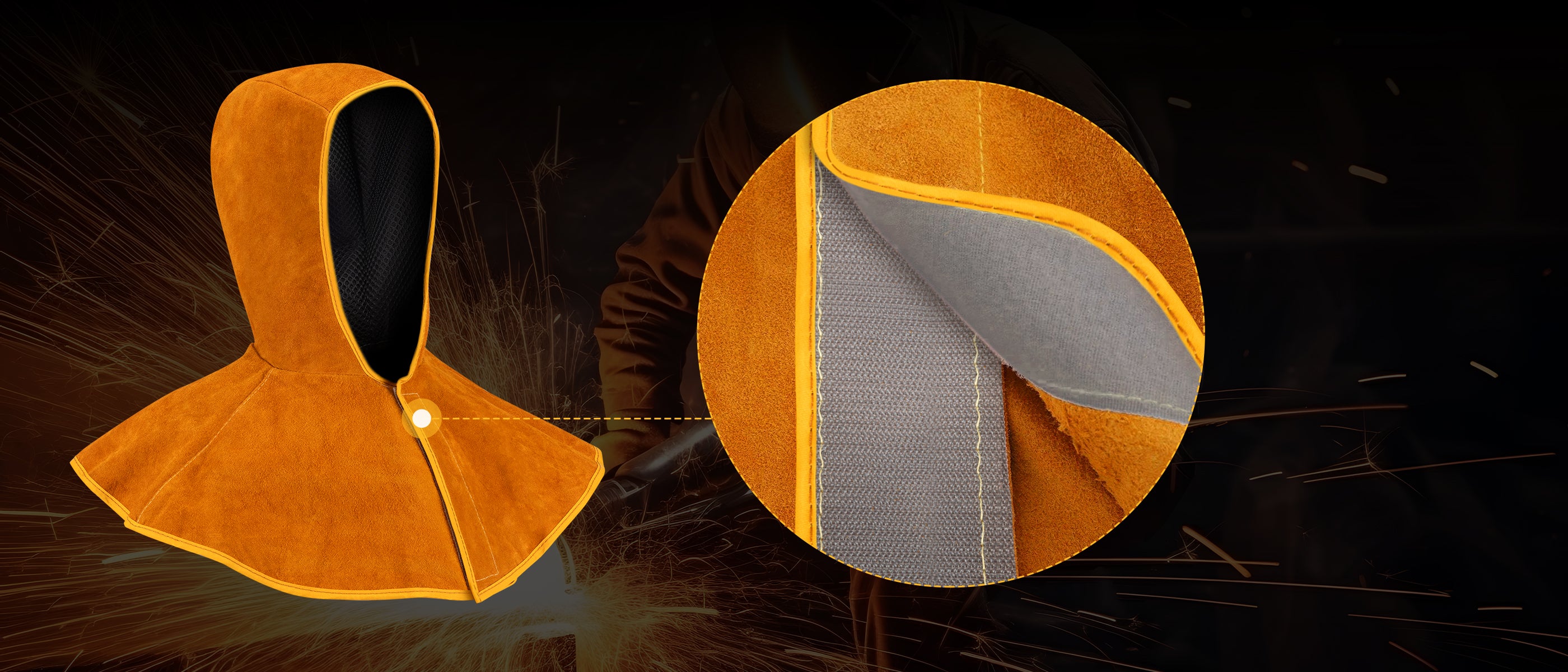 The Mecpow leather welding hood provides full head and neck protection with its dual-layer cowhide exterior and flame-retardant drape. Engineered to shield you from welding splatter, grinding sparks, sawdust, and drilling debris, this hood ensures top-tier safety during every task.