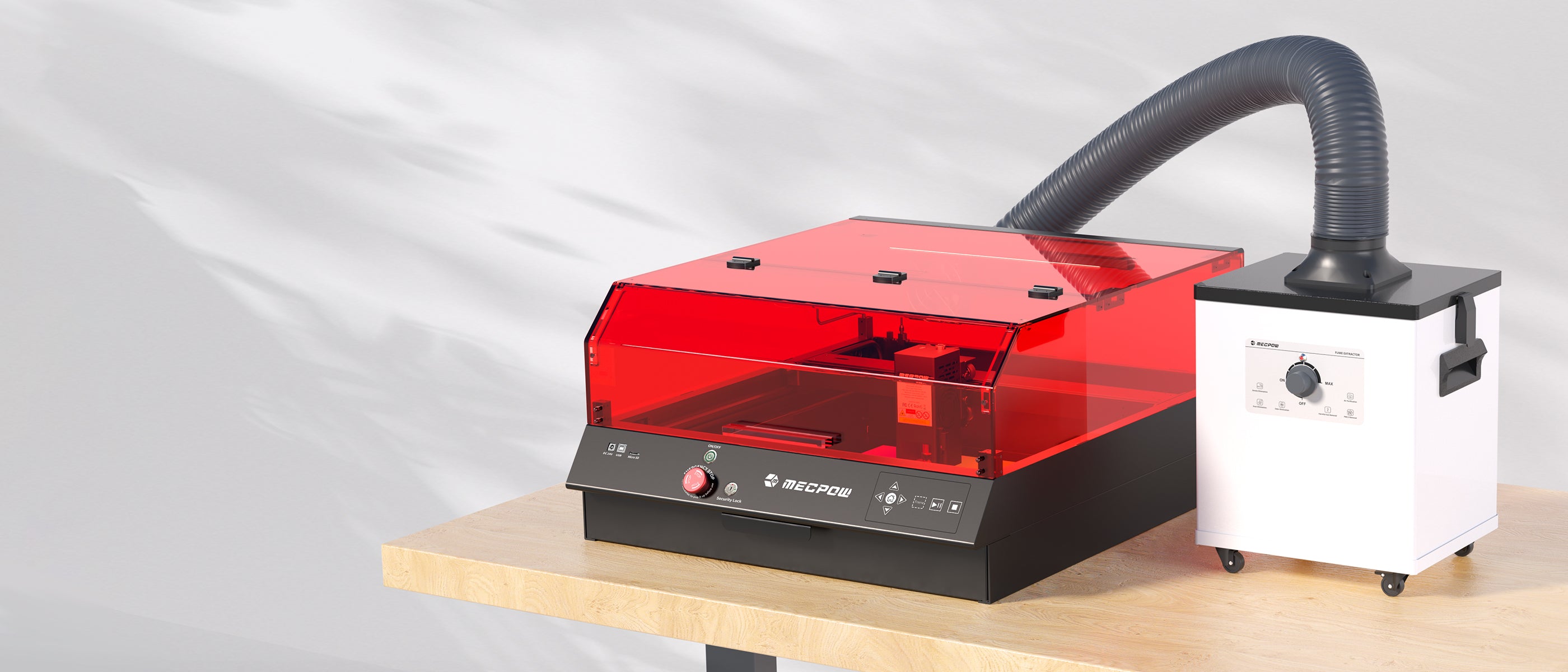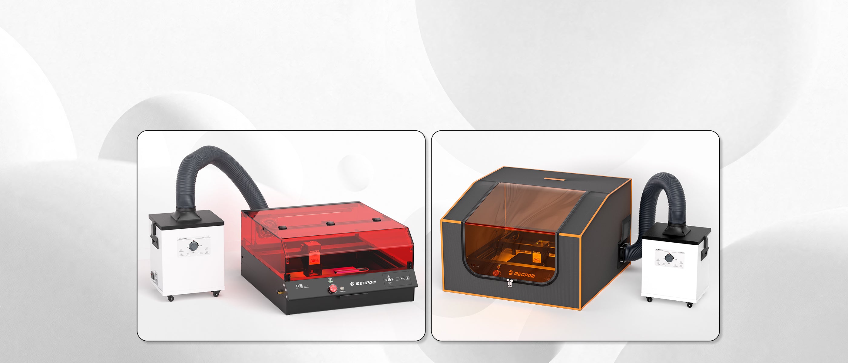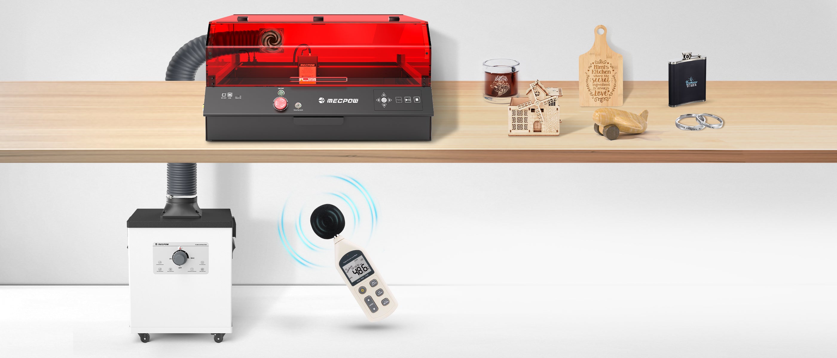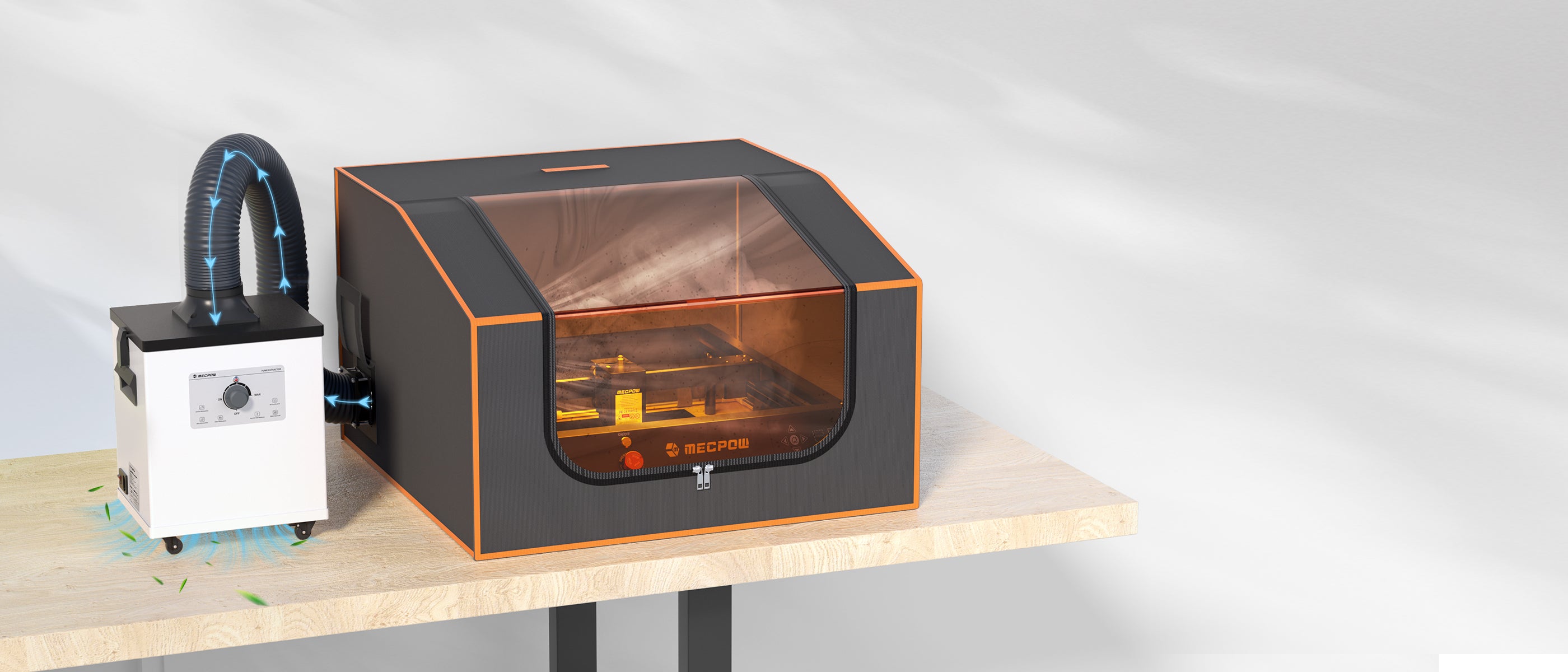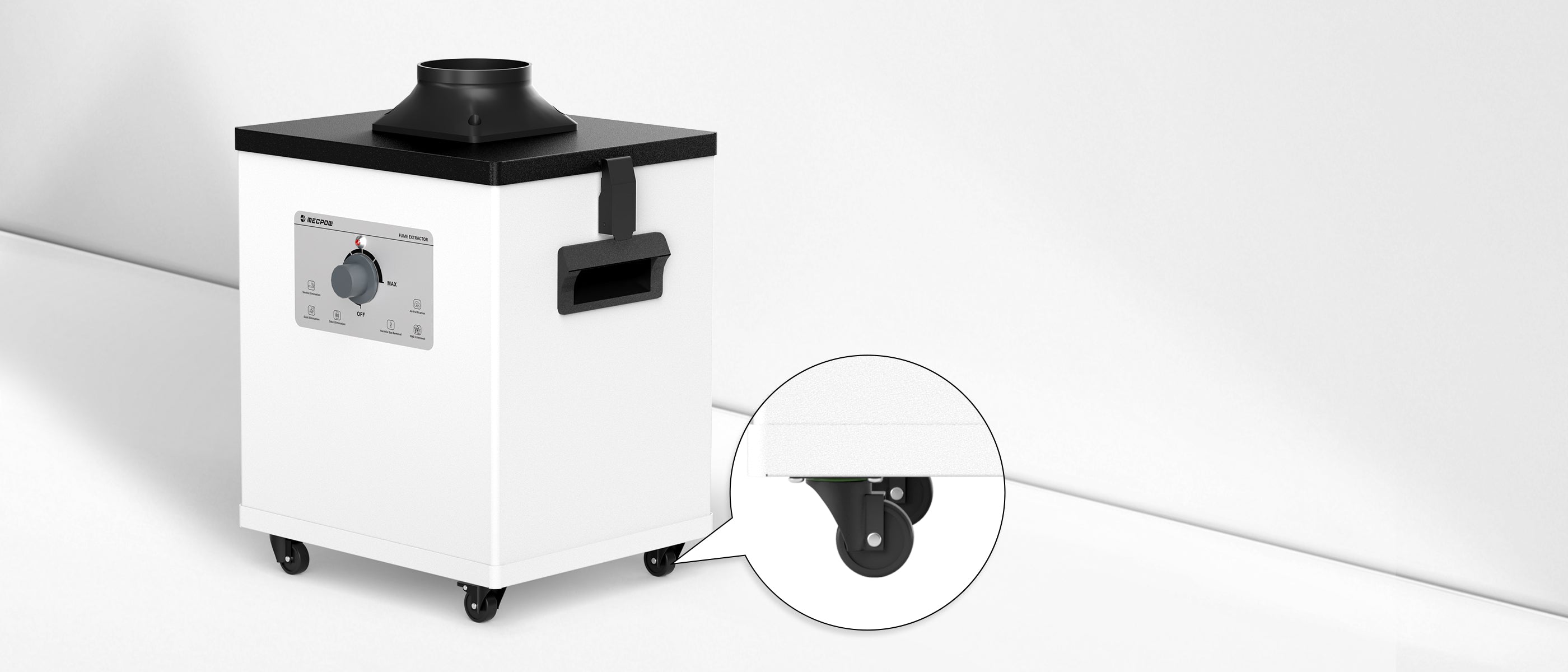 The Mecpow fume extractor operates at a flat 50dB noise level, allowing users to enjoy their distinctive engraving without disturbance. It is also equipped with smooth casters and handles for effortless movement, enabling you to enhance your engraving experience anywhere.