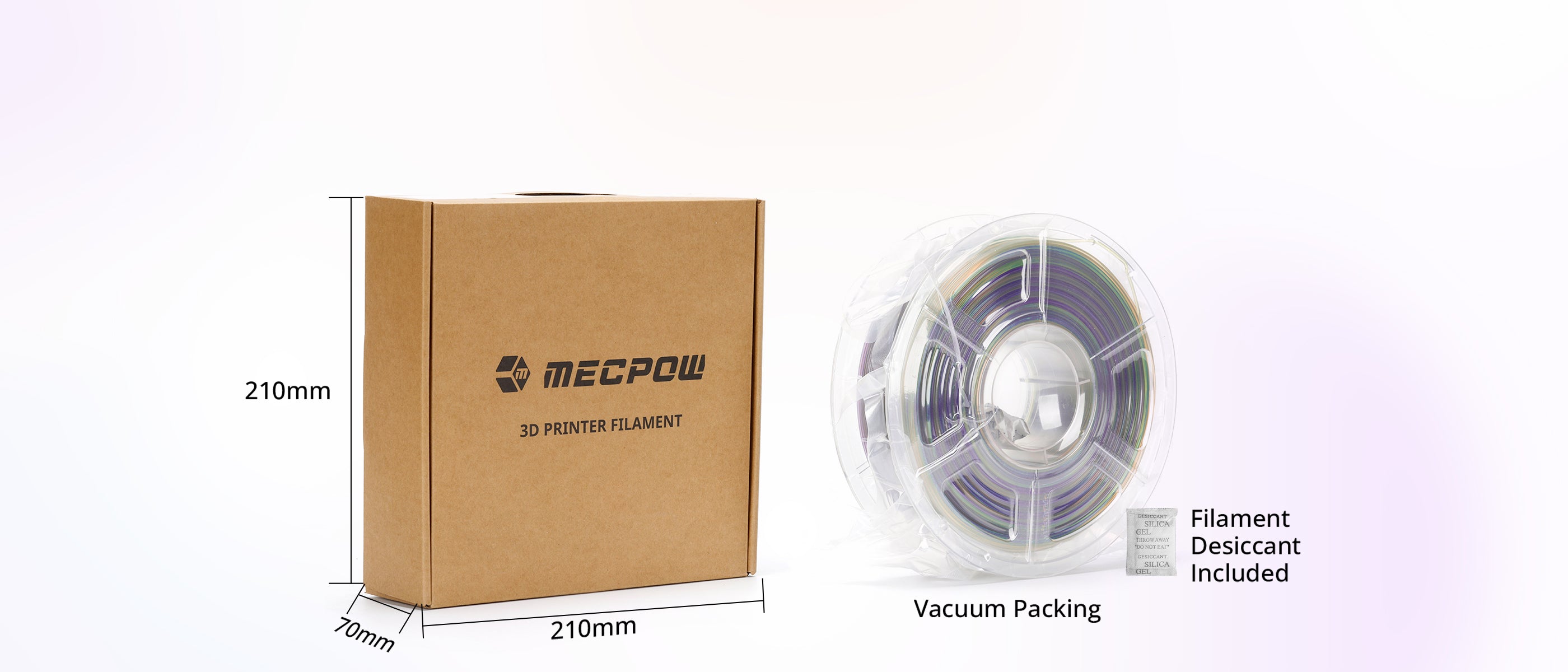 To maintain integrity and performance, Mecpow 3D printing filaments are thoughtfully vacuum-packed with a desiccant. This careful packaging method protects the filaments from dust and contaminants, ensuring you receive a pristine product ready for your next creative project.