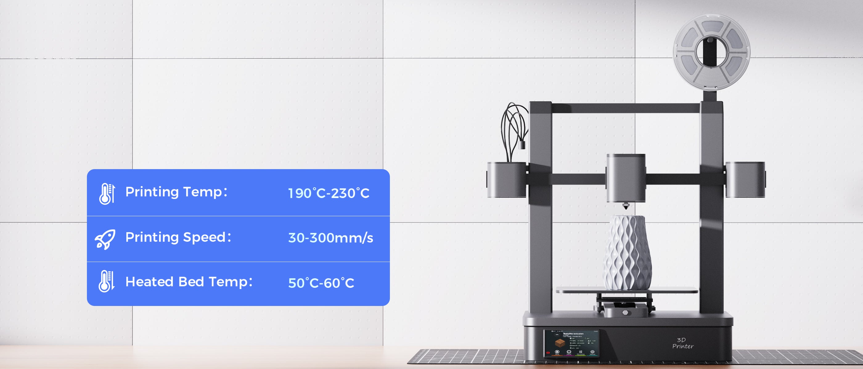 To ensure that the PLA+ filament can print optimally, we recommend printing at a nozzle temperature setting of 190-230°C, a hotbed temperature of 50-60°C, and a print speed of 30-300mm/s.