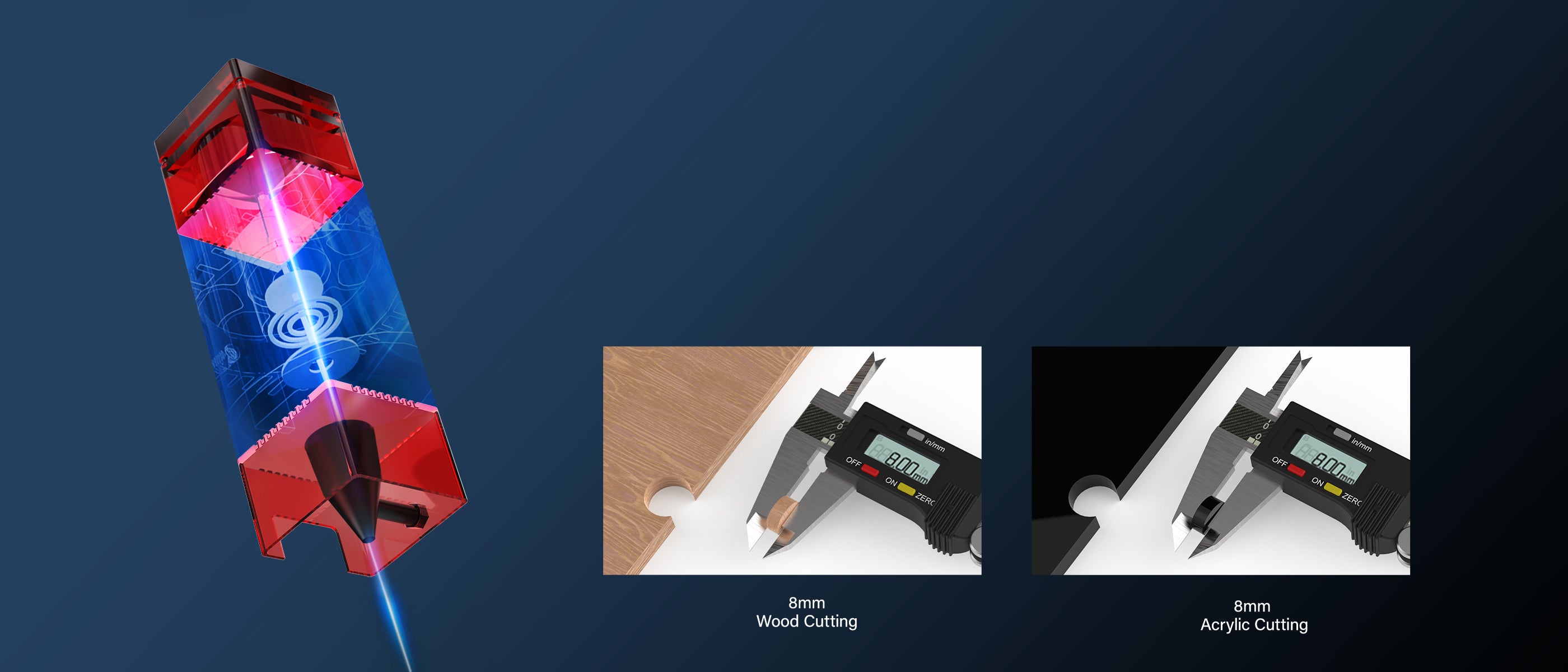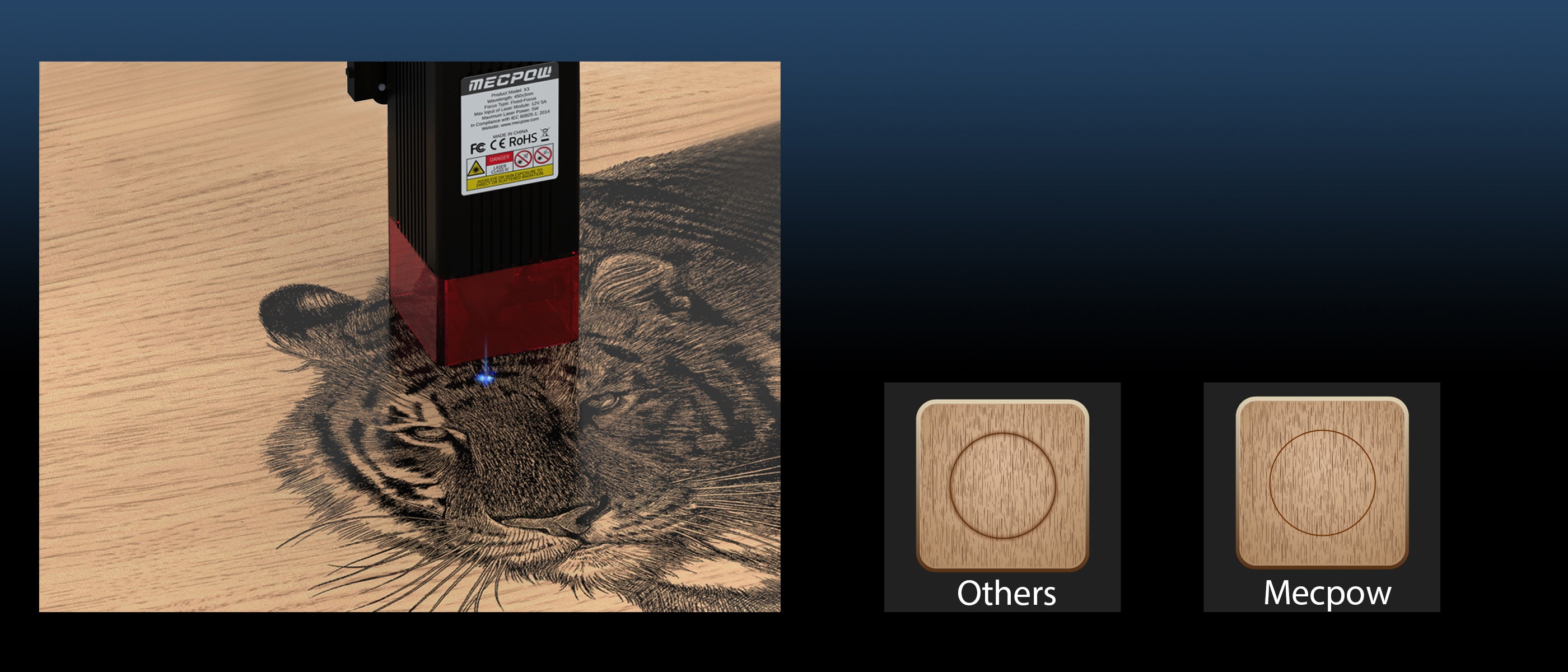 The Mecpow X3 adopts a 5W diode laser with a small focus of 0.05x0.07mm and an engraving accuracy of 0.01mm. The small spot size, along with short pulses, produces high peak power, which can achieve more accurate and deeper engraving and cutting. It can cut a wood board with an 8mm thickness and an acrylic board with an 8mm thickness.