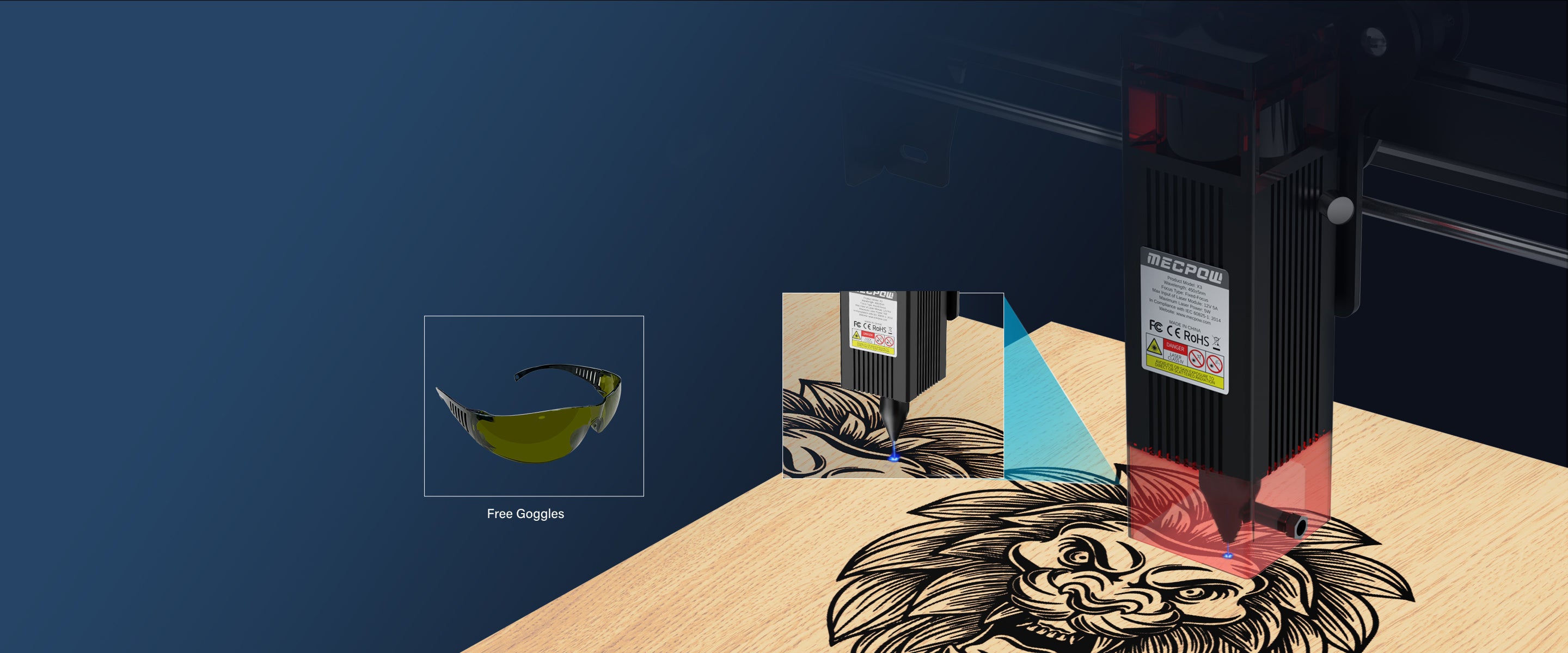 The laser engraving machine is equipped with a laser shield on the laser module, which can filter out diffuse light from the laser spot to a large extent. A pair of laser safety goggles is also included for better eye protection.