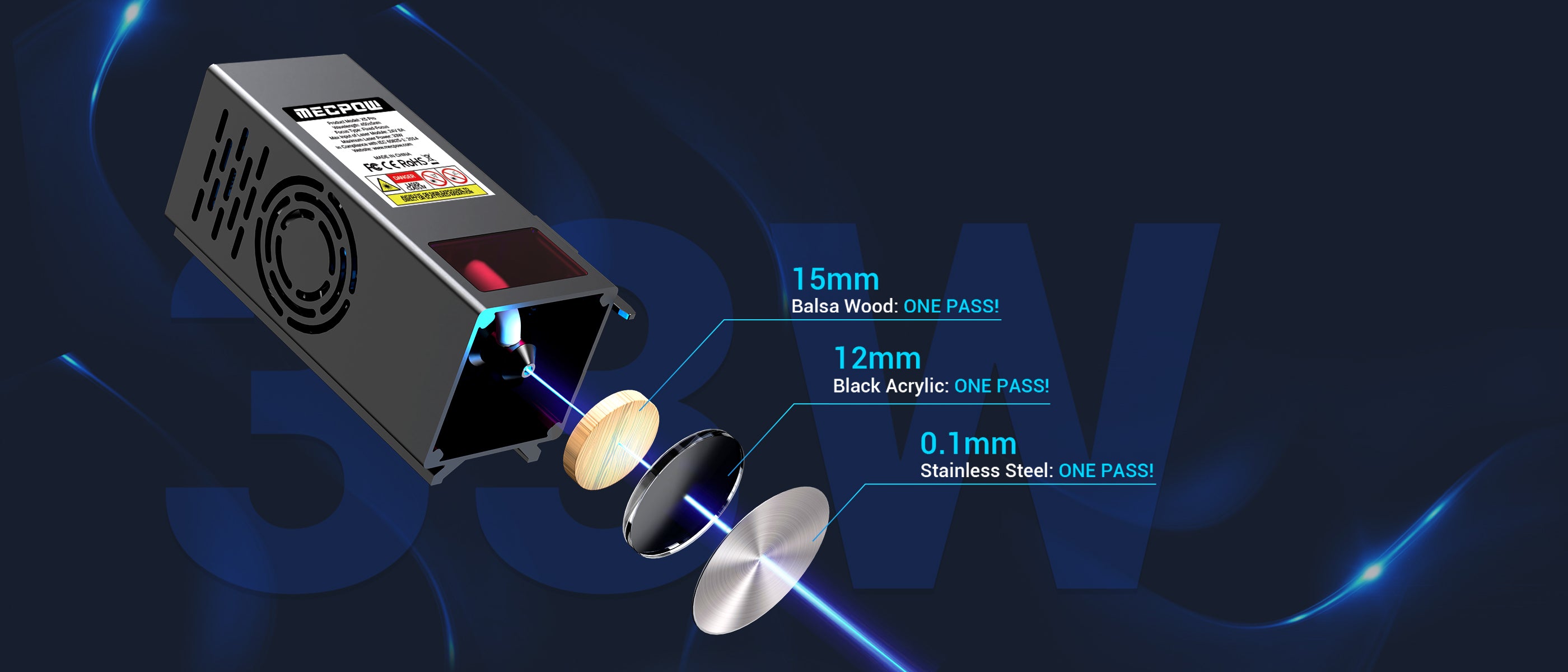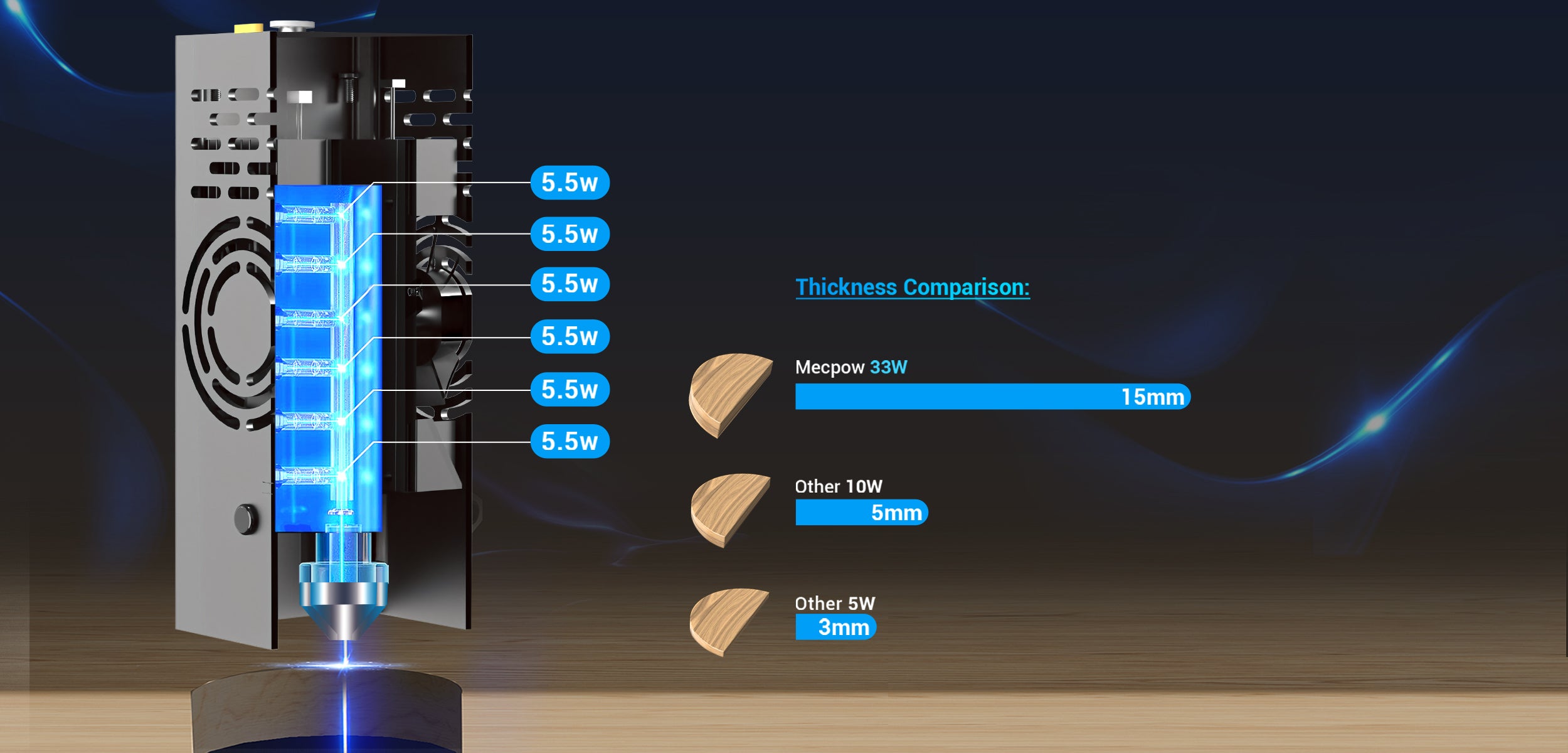 Thanks to its 33W high-power laser head, this powerful laser engraving machine effortlessly achieves single-pass cuts on various thick materials like 15mm thick wood boards, 12mm black acrylic sheets, or even 0.1mm stainless steel sheets—an exceptional cutting capability that exceeds that of standard 5W competitors by almost five times.