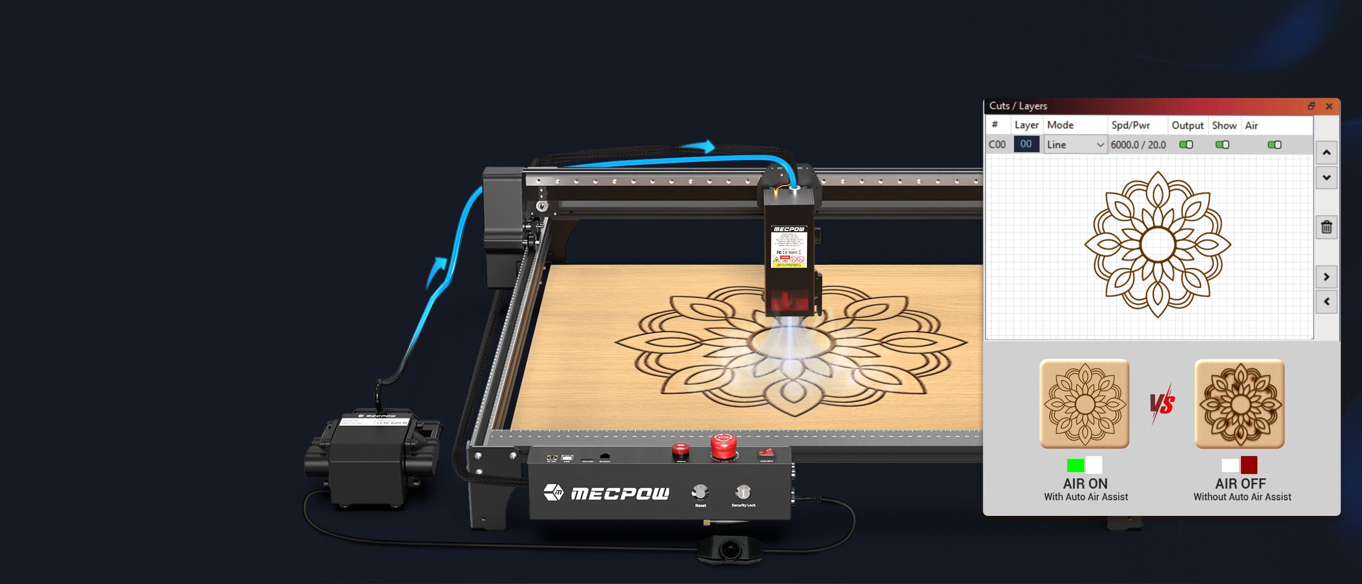 It includes a helpful auto air pump controlled via software settings for automatic activation and deactivation during engraving. With a powerful airflow of up to 30 liters per minute, it effectively disperses high-temperature smoke and clears debris produced to ensure the pristine quality of your work and enhance engraving accuracy by preventing yellowing or blemishes on every line.