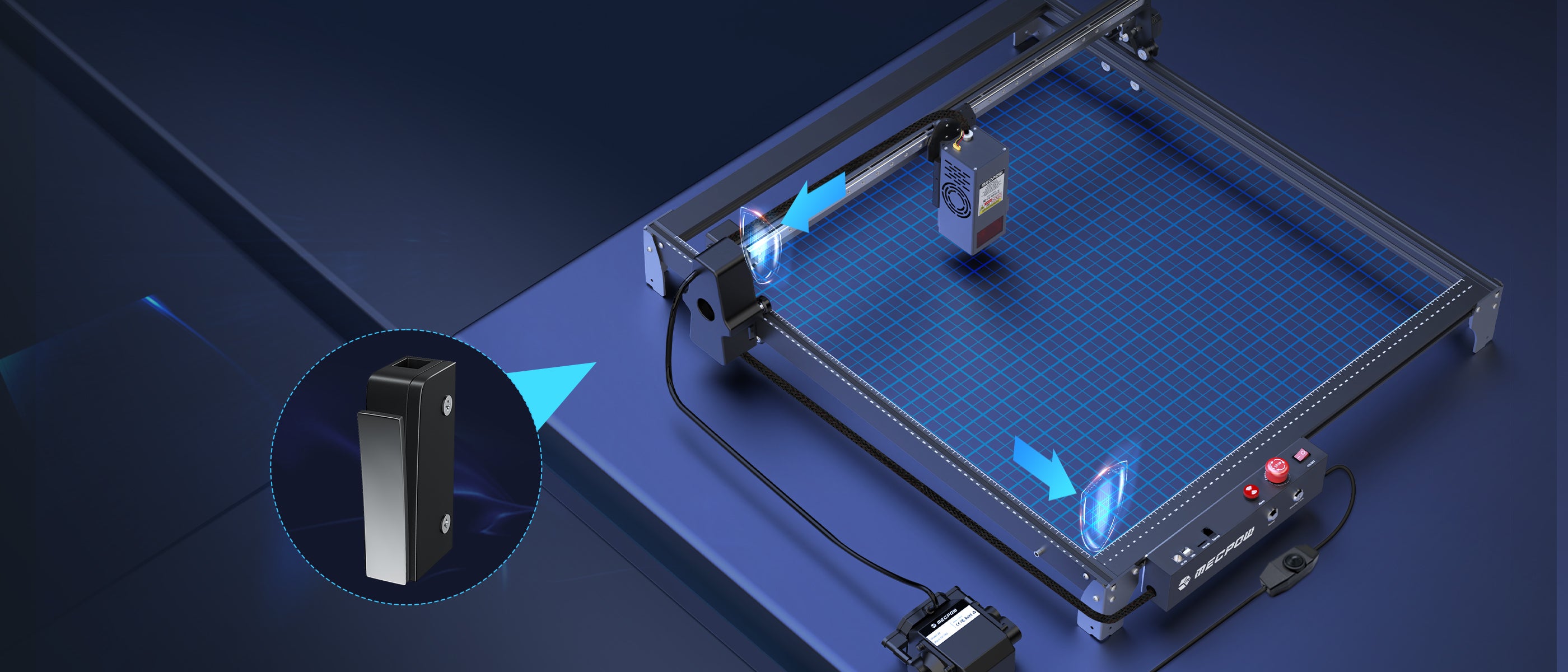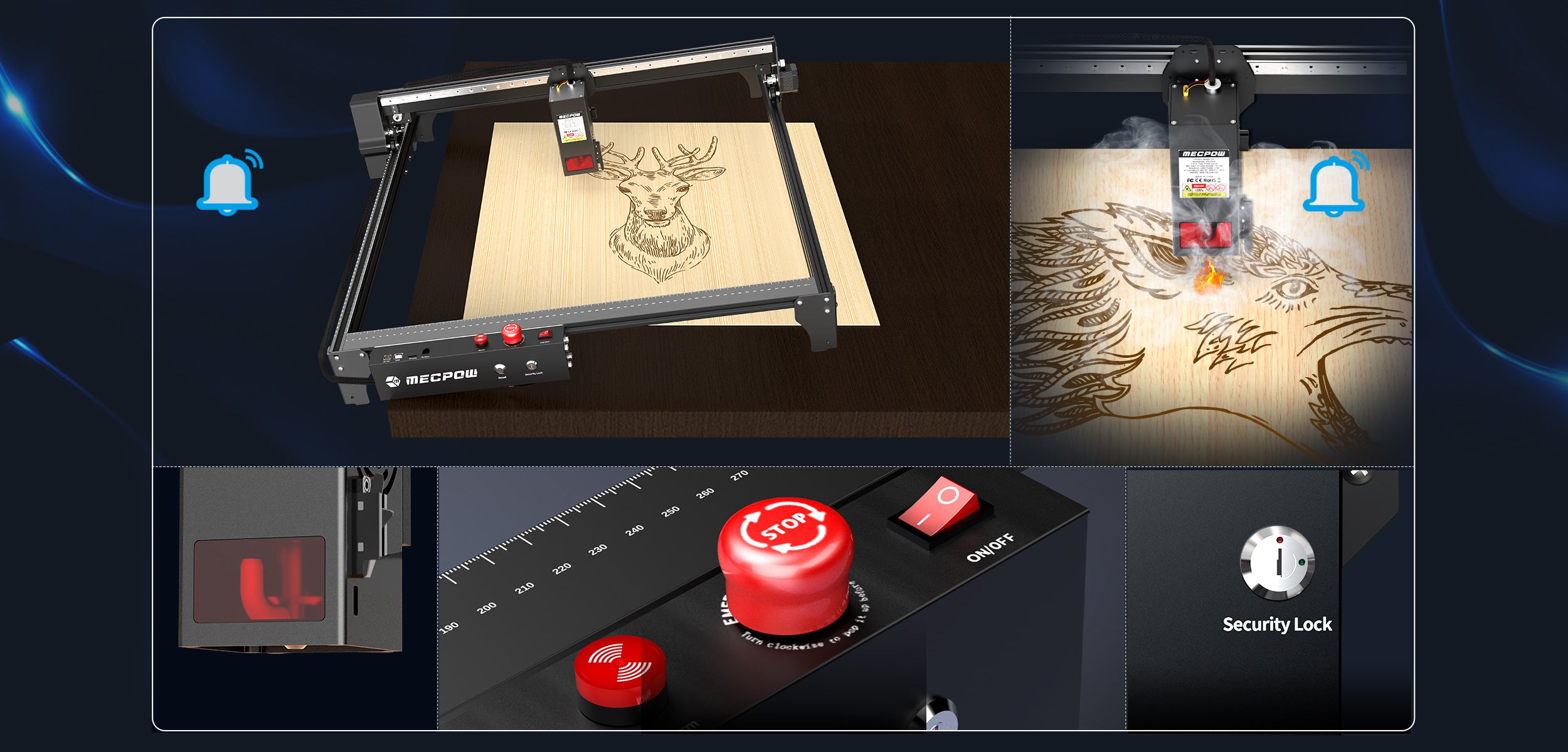 The Mecpow X5 Pro laser engraver boasts an unparalleled multiple protection system that prioritizes your safety and that of your family: a flame sensor detects any fire risks during engraving, triggering alerts and machine shutdowns. An emergency stop button halts operations instantly during emergencies. A tilt alarm rings if the machine is raised beyond a safe angle. A security lock prevents accidental operation by curious children, while the laser head includes eye-protective shielding. These safety measures ensure multiple layers of protection while you unleash your creative endeavors.